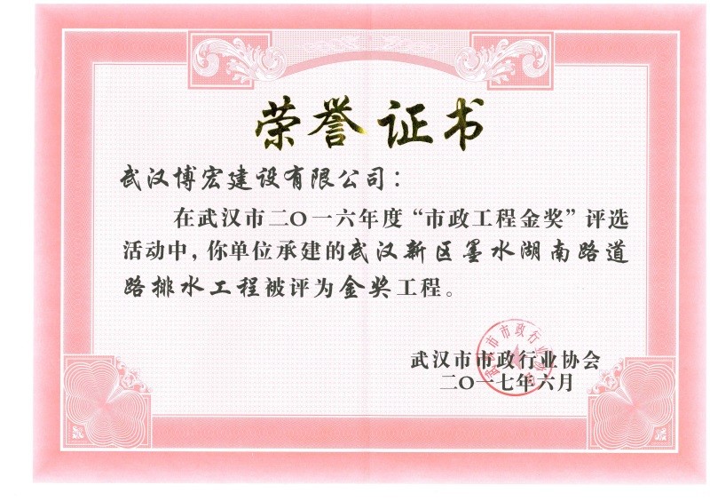 2016年度市政工程金獎(jiǎng)(墨水湖南路道路排水工程)