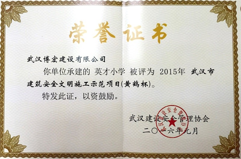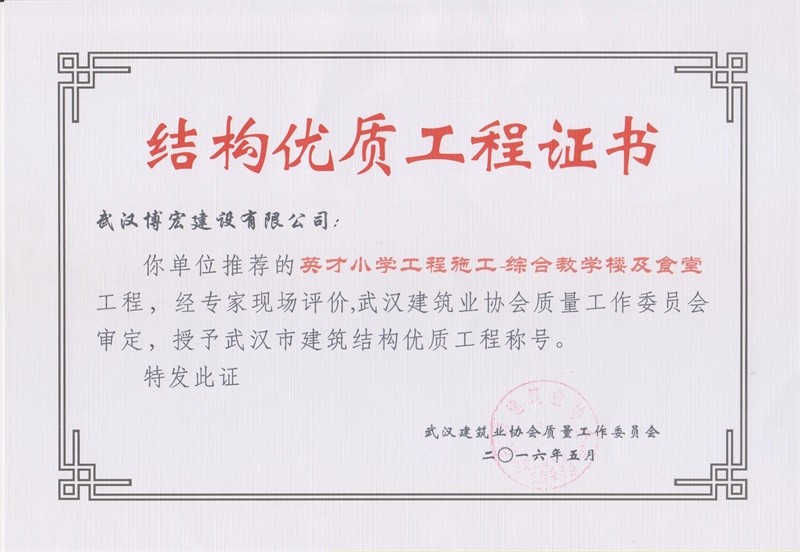 英才小學-教學綜合樓結構優(yōu)質工程證書