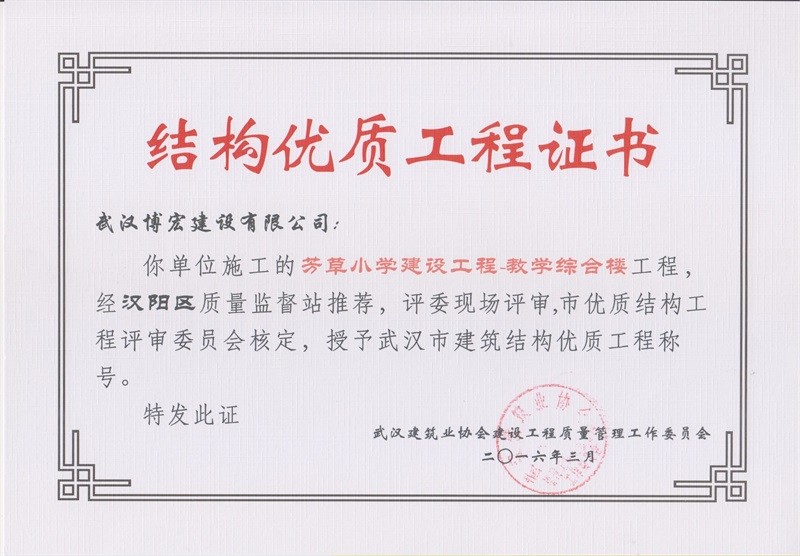 芳草小學-1#教學樓結構優(yōu)質工程證書