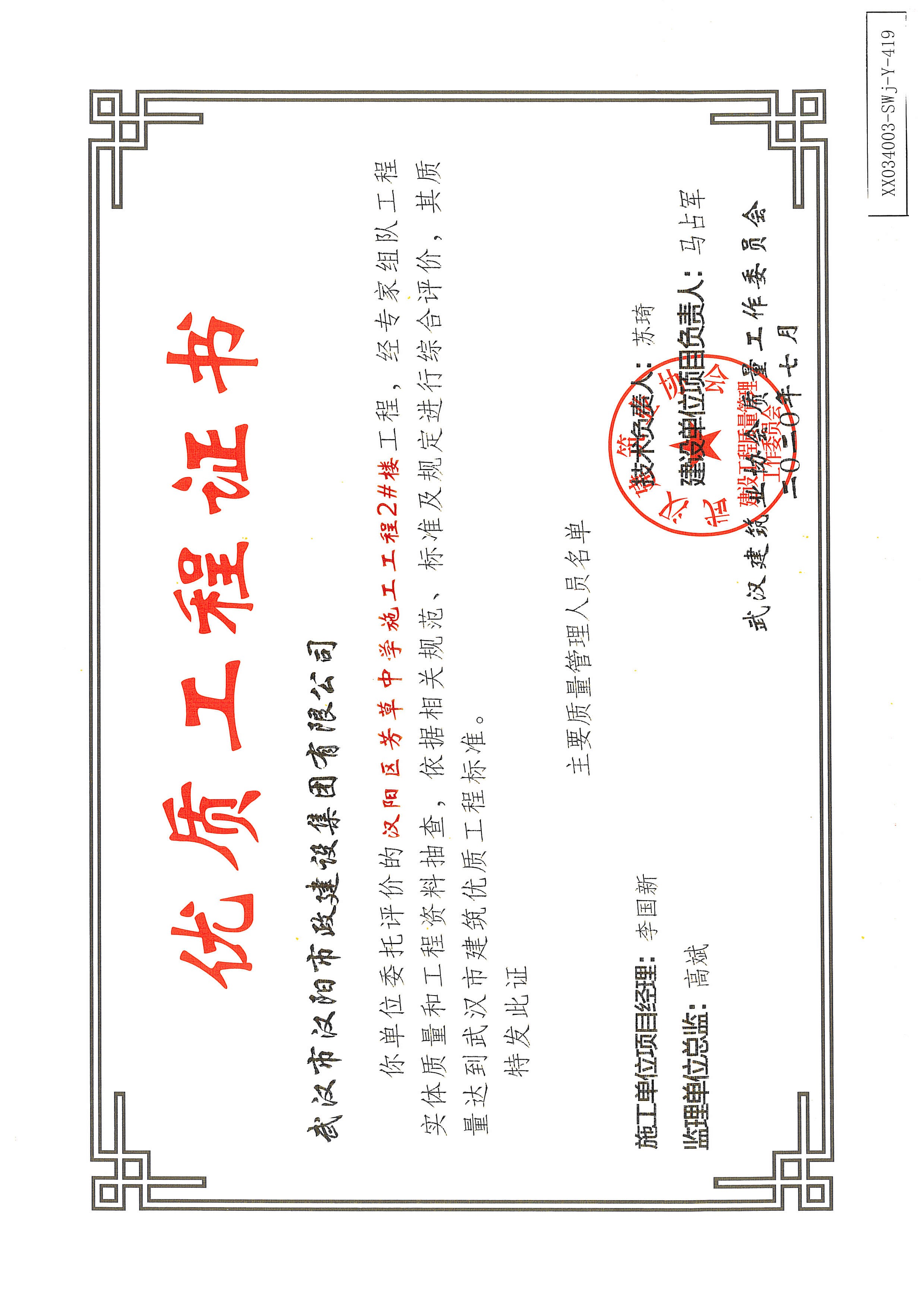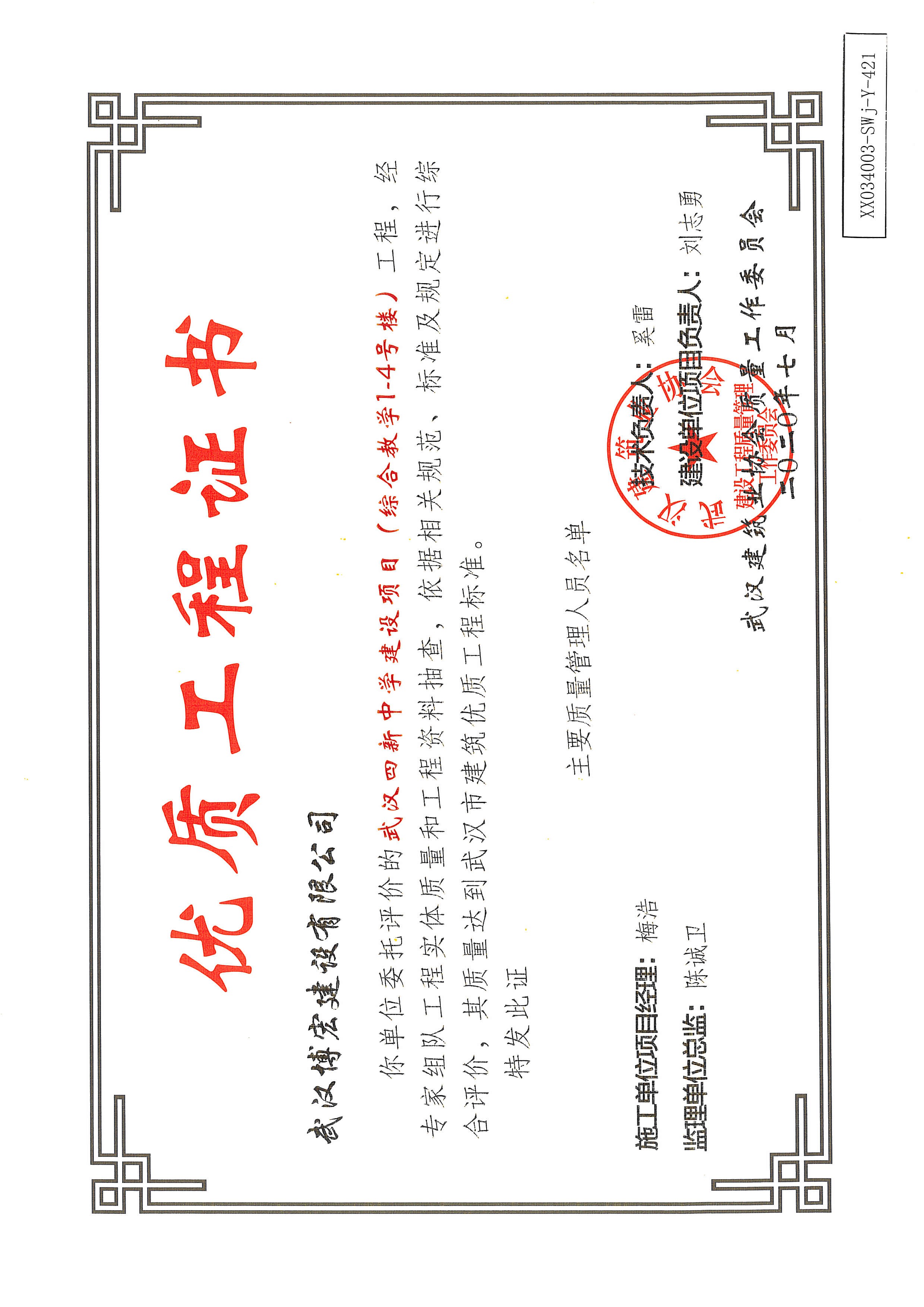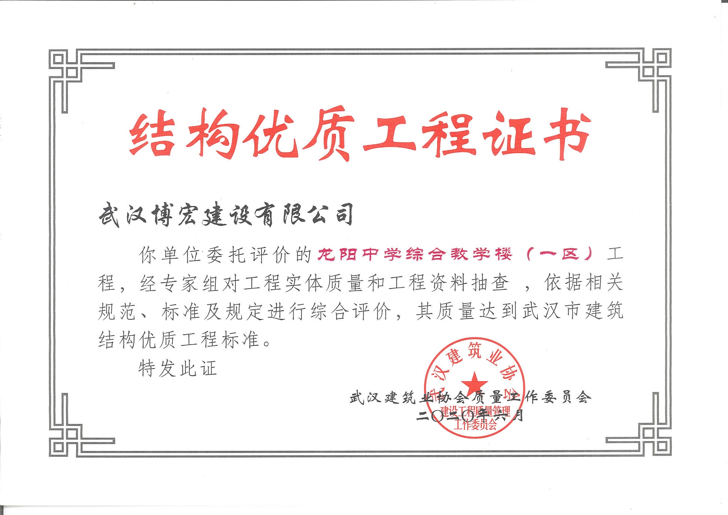 優(yōu)質(zhì)工程證書(武漢四新中學(xué)建設(shè)項(xiàng)目工程(綜合教學(xué)1--4號樓)