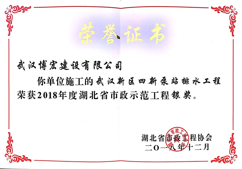 2018年度湖北省市政示范工程銀獎(jiǎng)(四新泵站排水工程)