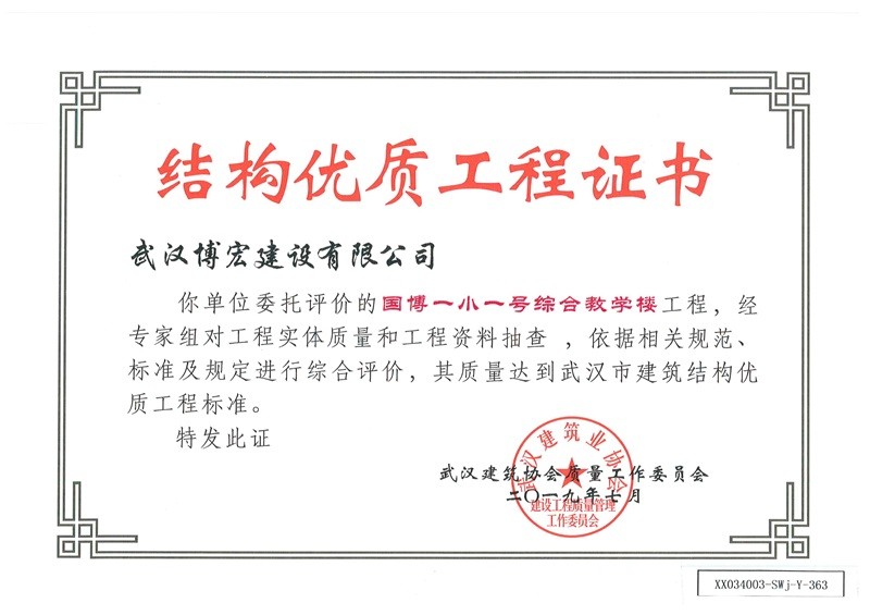 結(jié)構(gòu)優(yōu)質(zhì)工程證書(國(guó)博一小一號(hào)綜合教學(xué)樓)