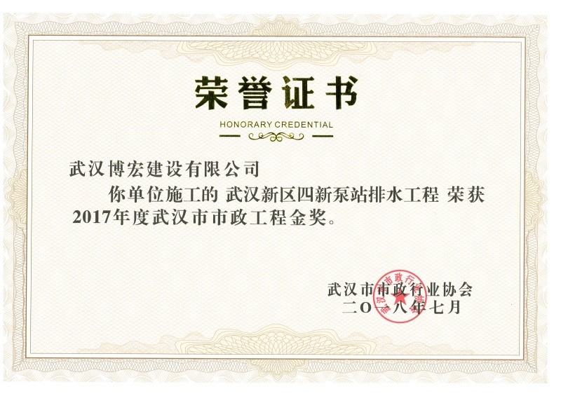 2017年度武漢市市政工程金獎(jiǎng)(四新泵站排水工程)
