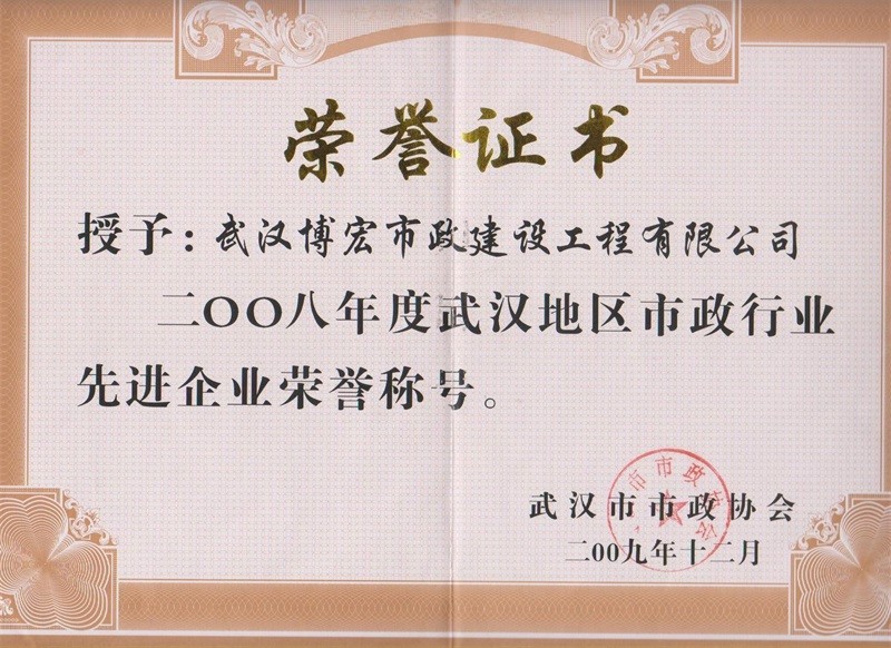 2008年度武漢地區(qū)市政行業(yè)先進(jìn)企業(yè)榮譽稱號