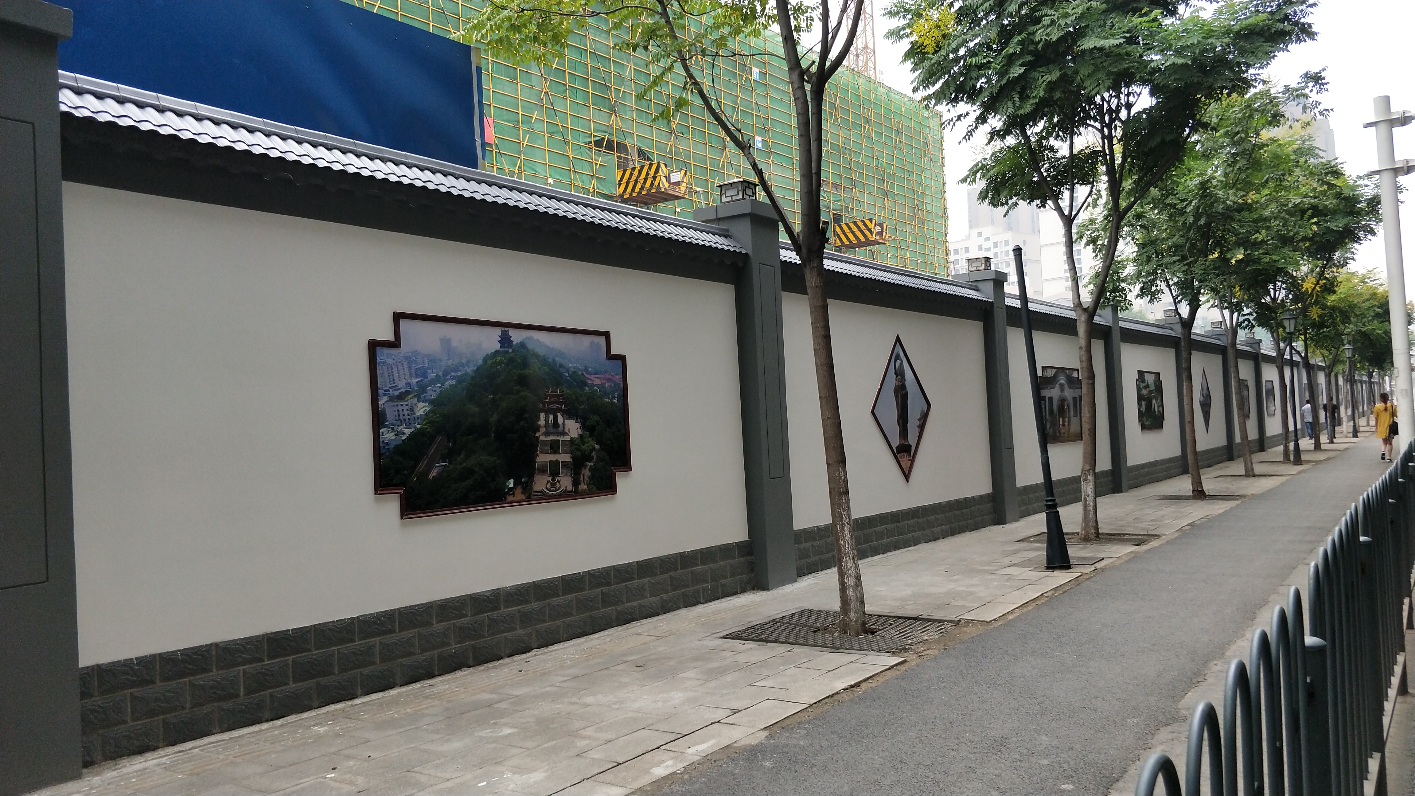 項(xiàng)目建設(shè)伊始便針對(duì)現(xiàn)場(chǎng)安全文明布置采取了專(zhuān)項(xiàng)措施,按照楚天杯的標(biāo)準(zhǔn)實(shí)施建設(shè)。工地圍墻方面,項(xiàng)目施工現(xiàn)場(chǎng)多采用磚砌體圍墻與“古典中國(guó)風(fēng)”裝飾,裝飾材料均采用環(huán)保節(jié)能材料,高度高于2.5m,墻體安全牢固無(wú)破損,且進(jìn)行了美化、亮化、彩色噴繪畫(huà)面及裝訂古典園林建筑畫(huà)框妝點(diǎn)。定期對(duì)宣傳墻、圍擋進(jìn)行檢查、清洗和刷新。有歪斜破損的及時(shí)更換,保證其干凈、整潔、無(wú)亂涂、亂寫(xiě)、亂張貼現(xiàn)象。