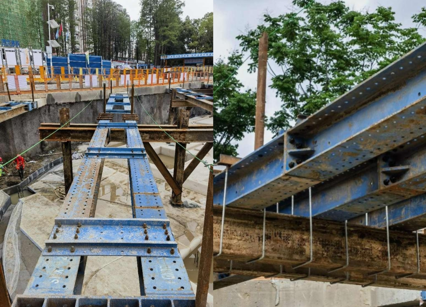 基坑南北兩側(cè)采用型鋼角撐,每一側(cè)角撐由四道型鋼斜撐組成,與冠梁形成45°角,由內(nèi)向外有雙拼型鋼和三拼型鋼兩種。型鋼采用HHC400ZC,長(zhǎng)度根據(jù)標(biāo)準(zhǔn)件長(zhǎng)度調(diào)整100A~12000A??缍容^大型鋼支撐設(shè)型鋼立柱,采用H488型鋼立柱。