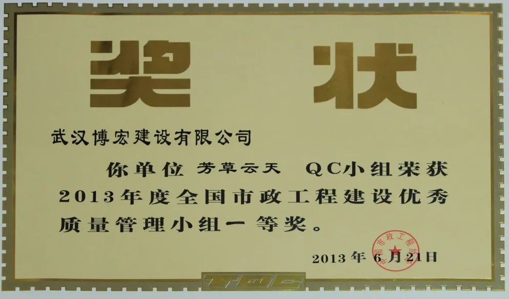 芳草云天QC小組成立于2011年5月31日,本小組從企業(yè)經(jīng)營(yíng)戰(zhàn)略、方針目標(biāo)和現(xiàn)場(chǎng)存在的問(wèn)題出發(fā),以提高效能、降低消耗、實(shí)現(xiàn)經(jīng)濟(jì)與社會(huì)效益雙贏為目的,全面優(yōu)化項(xiàng)目質(zhì)量。歷年來(lái)追求卓越、探索新品,曾獲得2013 年全國(guó)市政工程建設(shè)協(xié)會(huì)優(yōu)秀QC成果一等獎(jiǎng)、2014年湖北省市政工程建設(shè)優(yōu)秀QC成果二等獎(jiǎng)、2015年湖北省市政工程建設(shè)優(yōu)秀 QC成果一等獎(jiǎng)、2022年度中國(guó)施工企業(yè)管理協(xié)會(huì)工程建設(shè)質(zhì)量管理小組活動(dòng)成果二等獎(jiǎng)、2022年中國(guó)建筑業(yè)工程建設(shè)質(zhì)量管理小組活動(dòng)成果三等獎(jiǎng)等榮譽(yù)。